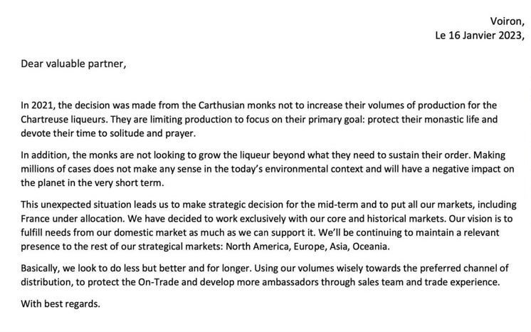 On January 16th, 2023, a letter from the Carthusian monks was released and explained their decision to not increase the volumes of production of Chartreuse in order “to focus on their primary goal: protect their monastic life and devote their time to solitude and prayer.” (see below the official letter).