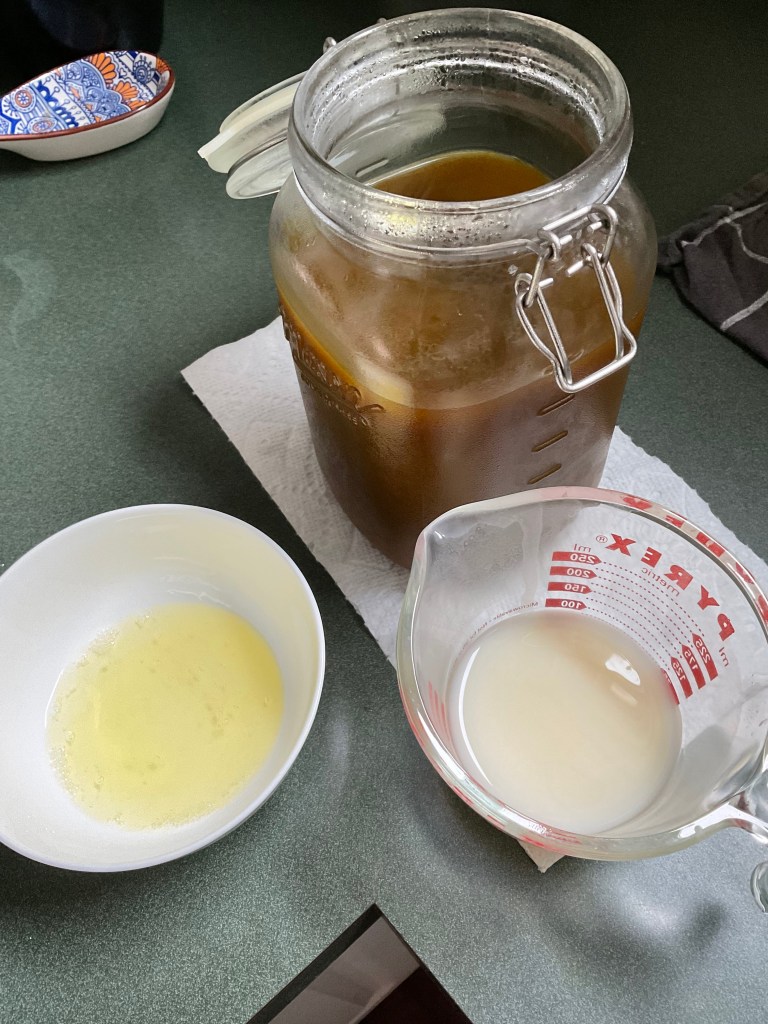 Day 7: Strain the tincture after 24h with a cheese cloth then filter. Make simple syrup with sugar and 1-2 tbsp of honey. Once cooled, filter into the Amaro tincture (see pictures below). The following step is optional, add 1/2 tsp of rose water, 1/4 tsp of orange blossom water, and 1/2 tsp Peychaud’s bitters. It’s normal at this point for your Amaro to look cloudy. Cool it overnight in the fridge or for an hour in the freezer (important!).